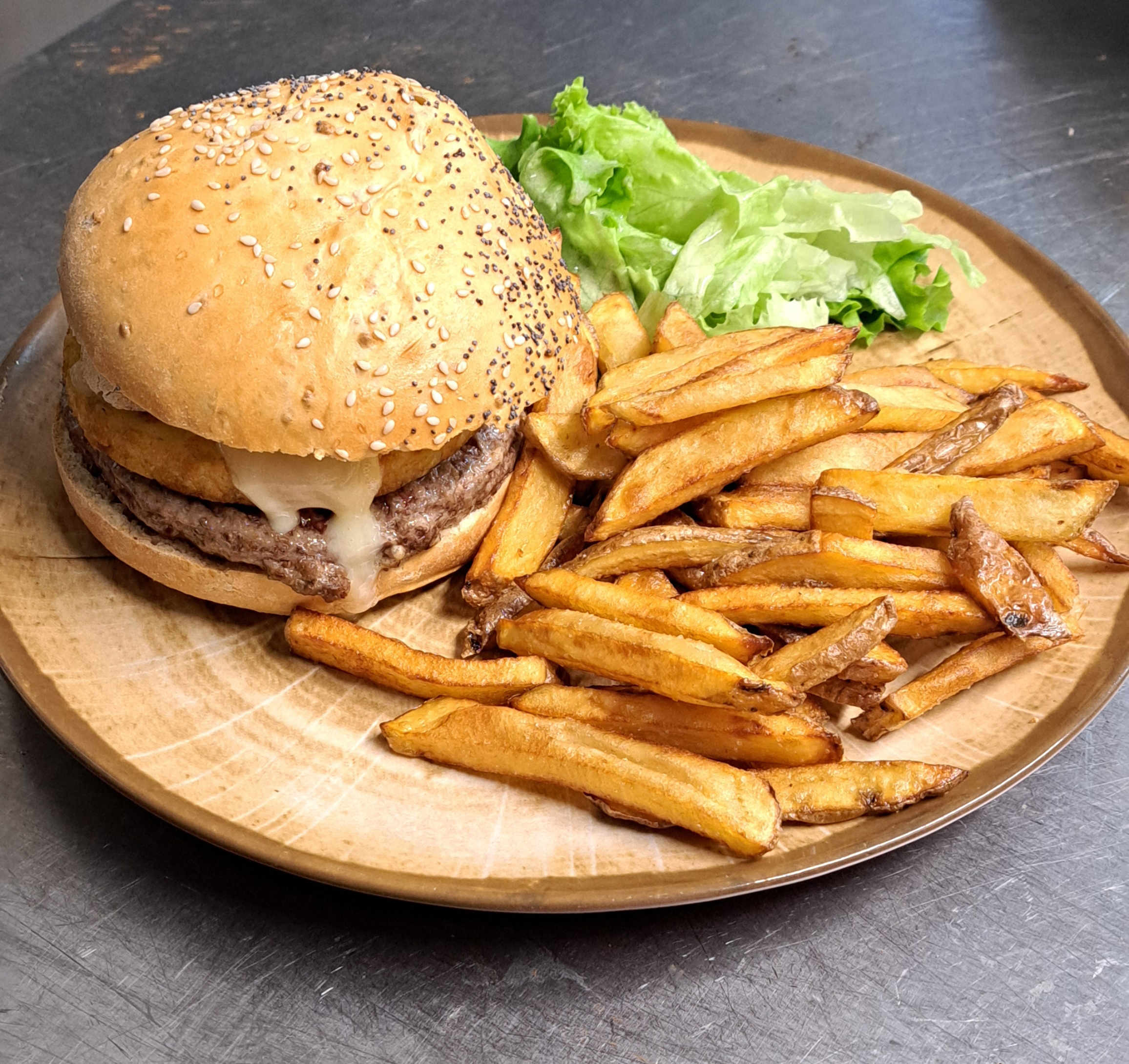 Steack haché façon bouchère, galette de pomme de terre, époisses, oignon rouge, sauce moutarde miellée, frites fraîches «maison»