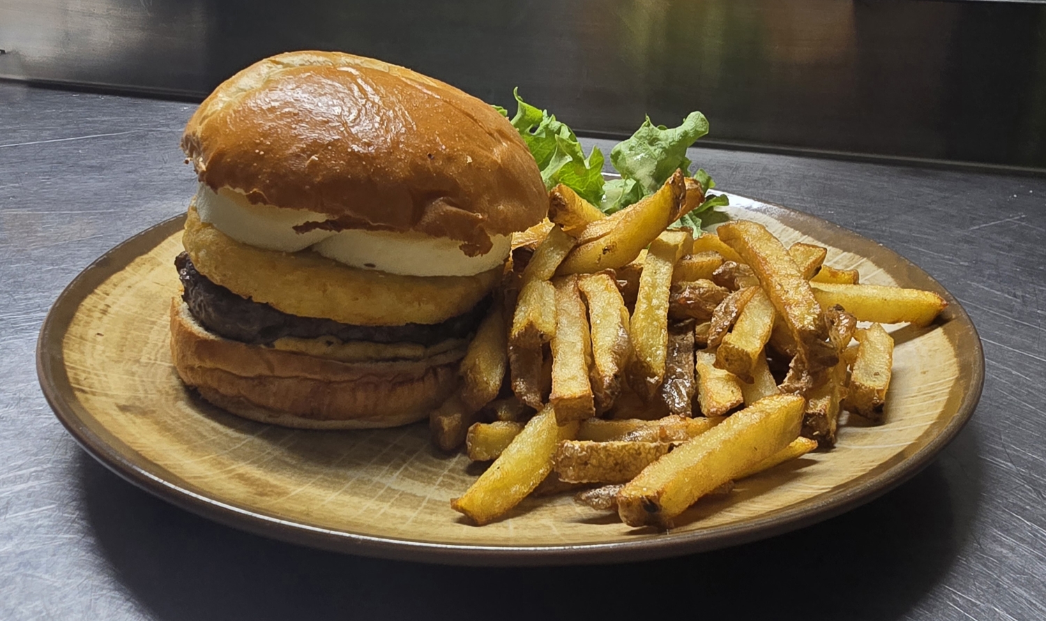 Steack haché façon bouchère, galette de pomme de terre, chèvre frais, oignon rouge, sauce moutarde miellée, frites fraîches «maison»