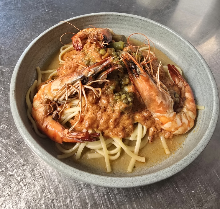 Linguines aux gambas et légumes sauce tomate crémée