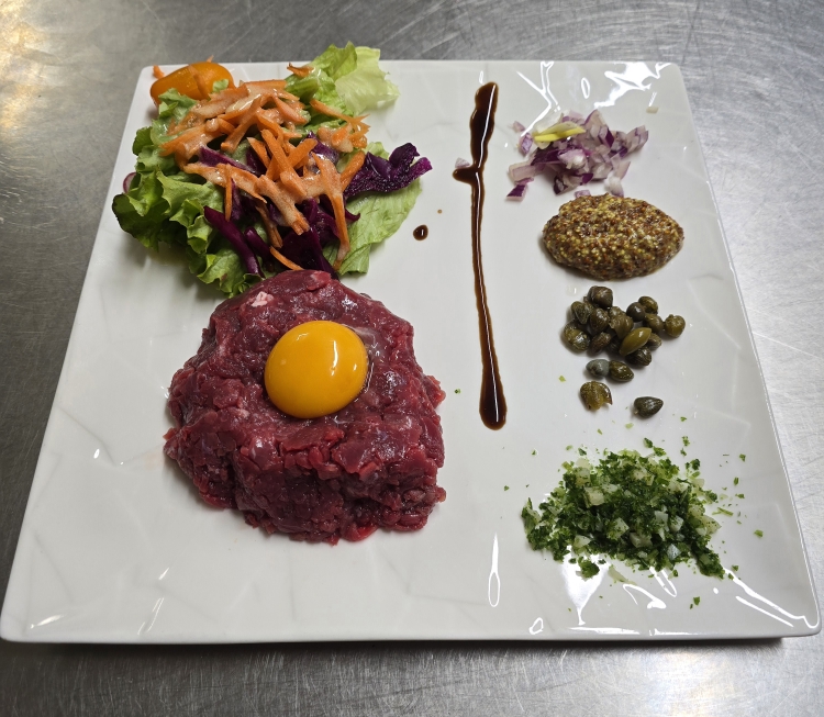 Steak haché façon bouchère, galette de pomme de terre, foie gras, oignon rouge, sauce moutarde miellée, frites fraîches « Maison »